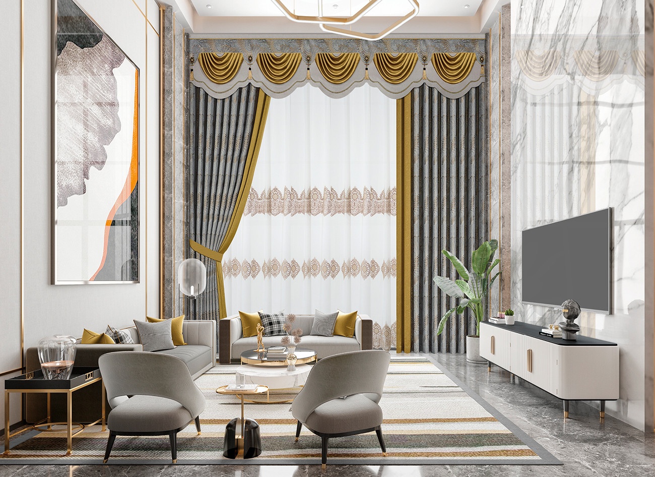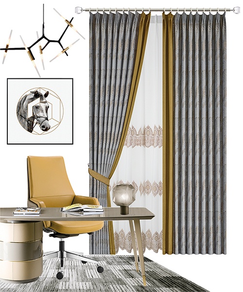 沉靜內斂的高級灰搭配一抹時髦姜黃色,完美結合彰顯優雅摩登的撩人誘惑。簾頭波形輪廓優雅大氣,為空間平添一份婀娜情韻,成就—種休閑式浪漫。