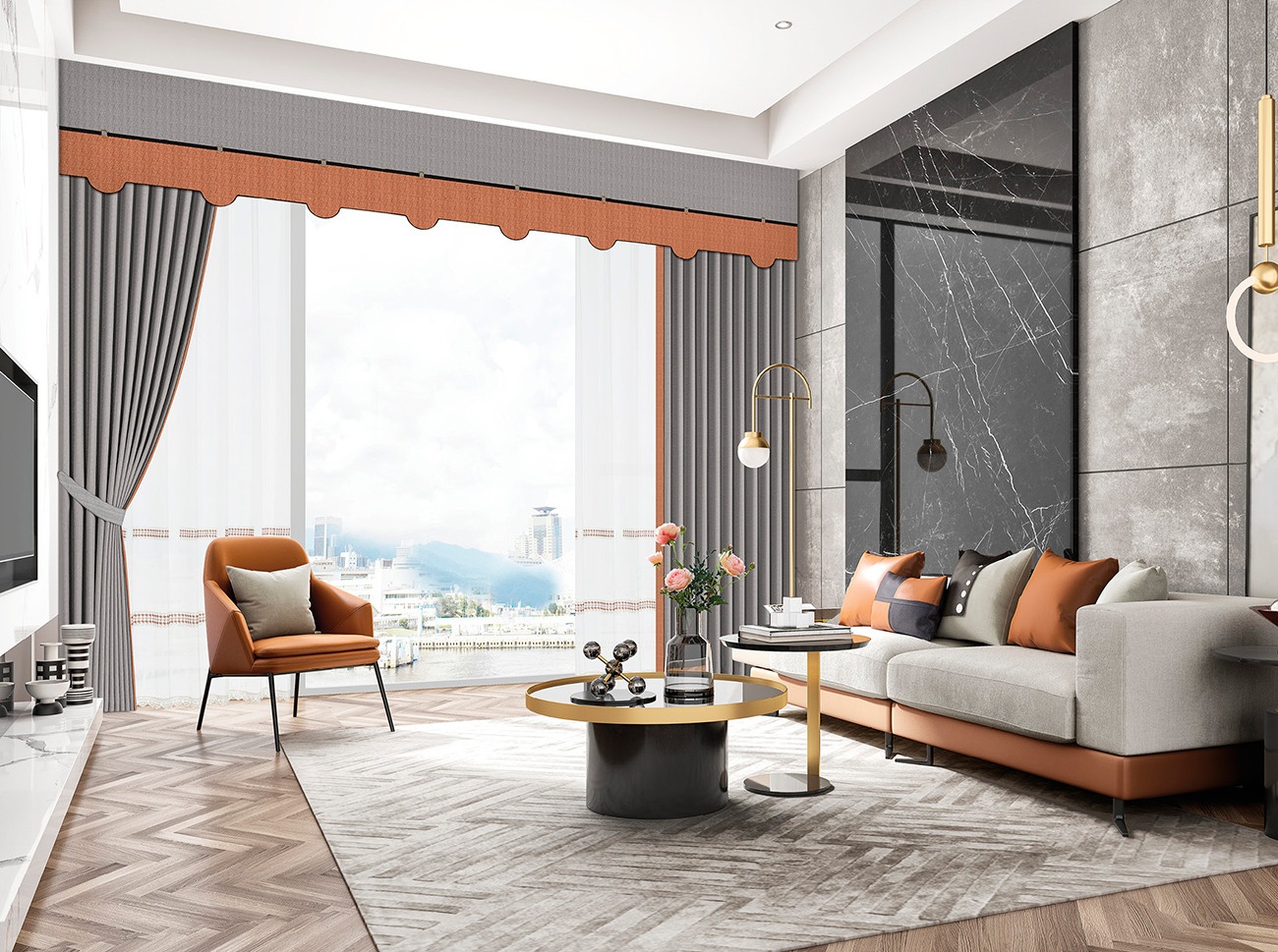 雅致的灰色調(diào)勢帶來精致感,一抹張揚的橘調(diào)流動其中,深淺遞進的層層伏筆,傳遞審美與情緒,明快而富有張力的色彩搭配,加深了空間的立體性和層次感,時尚簡約的空間風(fēng)格氣質(zhì)非凡,再現(xiàn)文化基因里風(fēng)雅與曼妙的生活。
